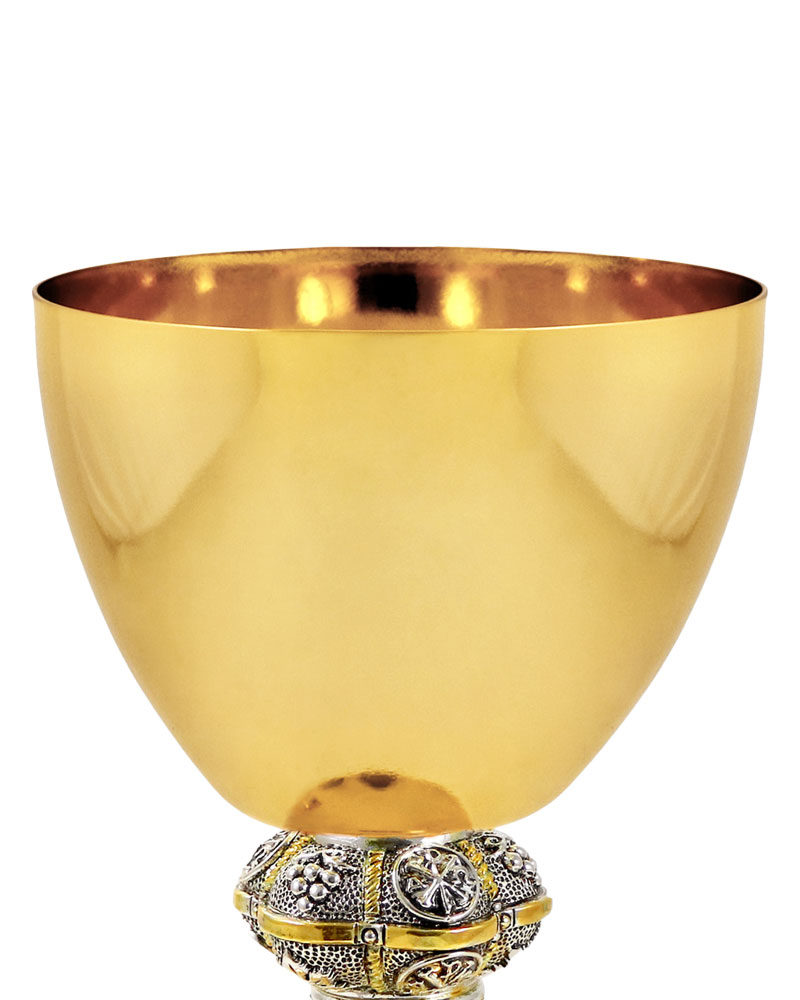 Dieser liturgische Kelch aus hochwertigem Messing ist außen matt versilbert und besitzt eine innen polierte, vergoldete Cuppa mit 10 cm Durchmesser. Die Gesamthöhe beträgt 20 cm. Der kunstvoll gestaltete Nodus mit feiner Ornamentik bietet guten Halt beim Zelebrieren und unterstreicht die klassische Formgebung. Die matte Oberfläche ist unempfindlich gegen Fingerabdrücke und leicht zu reinigen. Zum Lieferumfang gehört eine passende Patene mit 14 cm Durchmesser. Gefertigt in traditioneller Handarbeit, eignet sich der Kelch für den regelmäßigen Einsatz im liturgischen Dienst.