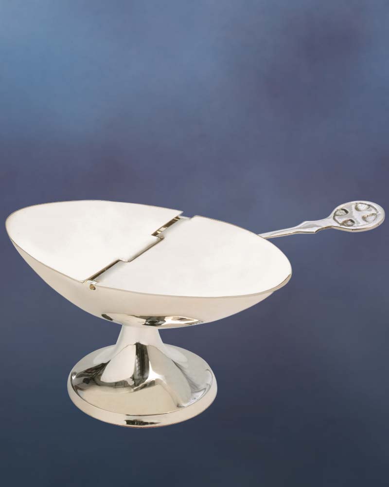 Das Weihrauchschiffchen aus versilbertem Messing ist ein hochwertiges liturgisches Gerät mit präzisen Abmessungen von 7 x 13 cm. Der praktische Klappdeckel schützt den Weihrauch zuverlässig und ermöglicht eine sichere Aufbewahrung. Die versilberte Oberfläche verleiht dem Schiffchen eine edle Optik und unterstreicht die sorgfältige Verarbeitung. Lieferung inklusive Löffel.