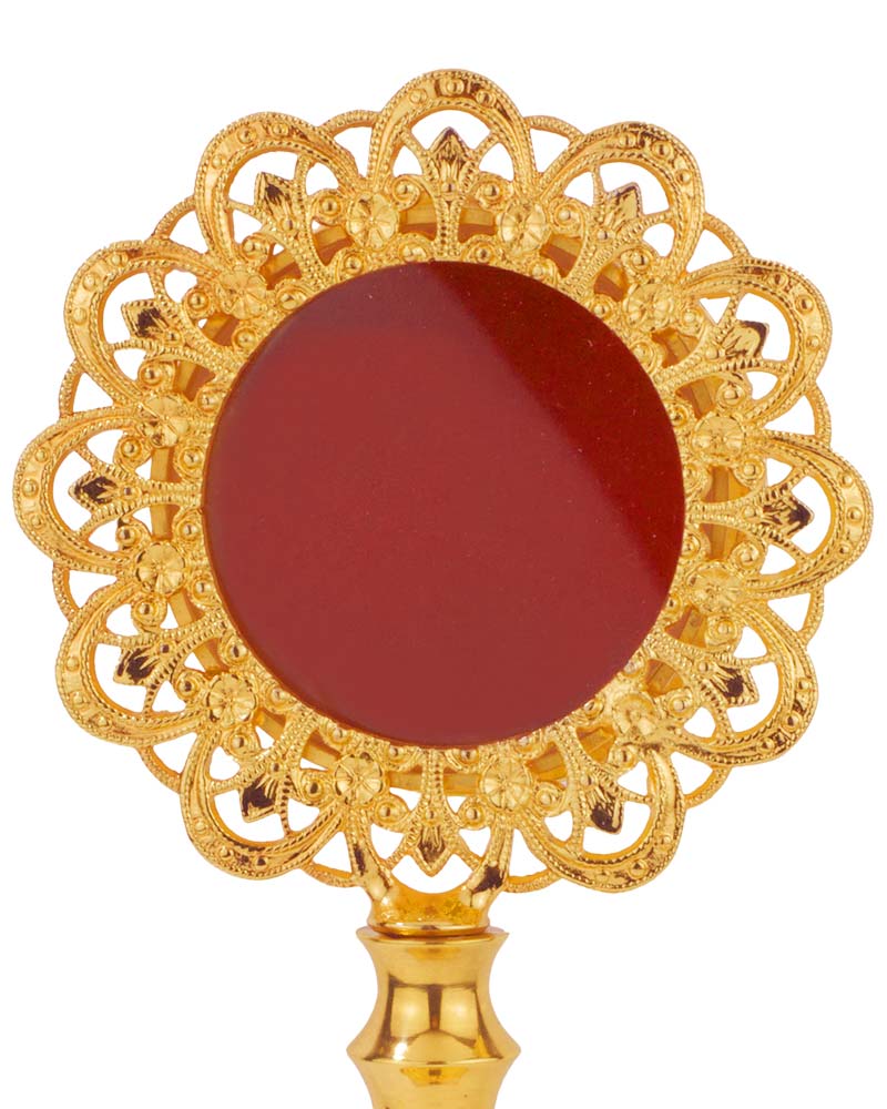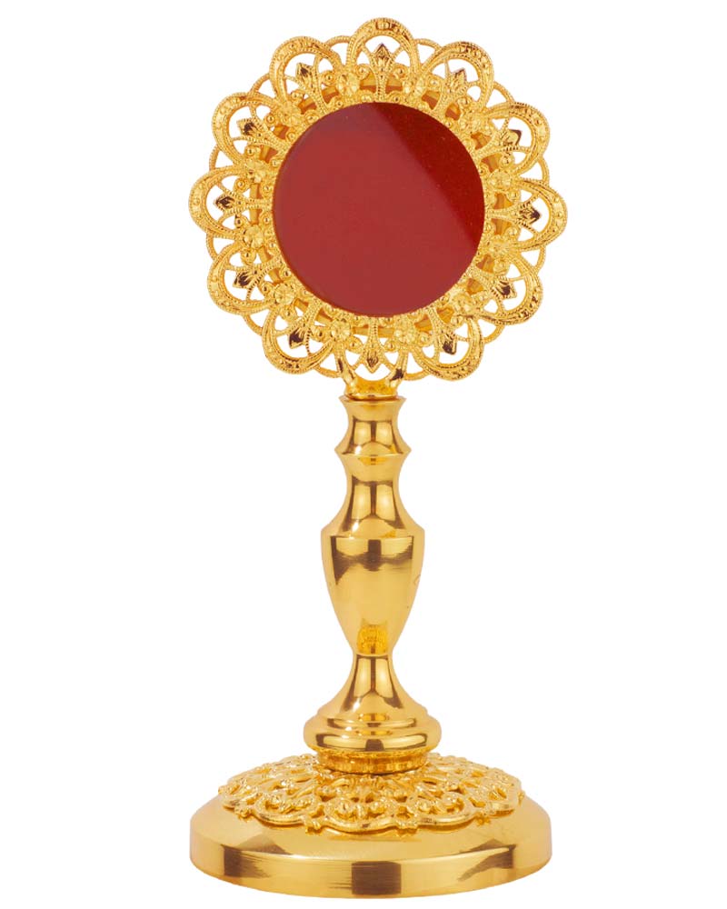 Dieses vergoldete Reliquiar aus hochwertigem Metall ist 11 cm hoch und 6 cm breit. Die fein gearbeitete Ornamentik verleiht dem Stück eine edle und zeitlose Optik. Es eignet sich zur sicheren Aufbewahrung und Präsentation von Reliquien. Ideal für Kirchen und Sammlungen, die auf eine ansprechende Darstellung von Reliquien Wert legen.