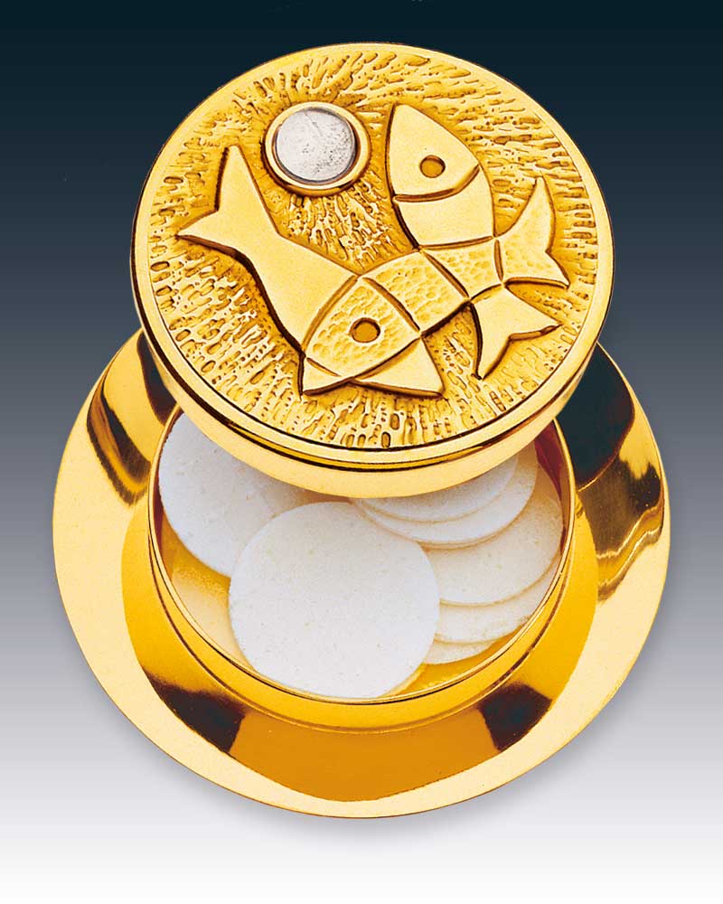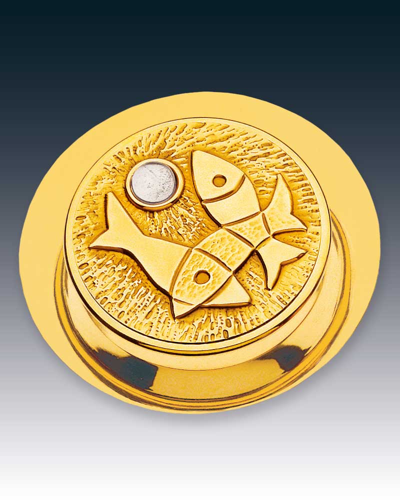 Versehpatene mit Patenenrand, vergoldet Fische mit Naturstein 10 cm Ø für ca. 20 Hostien. Passend auch für unsere Versehtaschen.