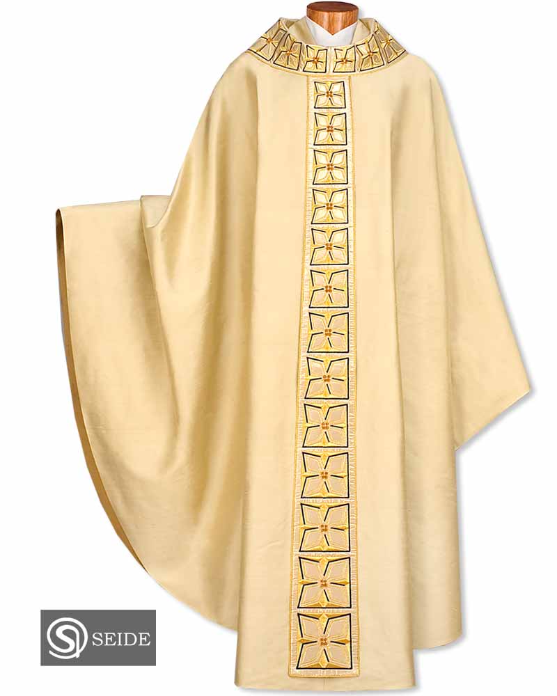 Messgewand in klassisch moderner Auffassung, naturfarbene Seide, gold abgefüttert, 135 cm lang. Der umgelegte Stehkragen und der konisch verlaufende Mittelstab sind mit wertvollen Ornamenten und Swarowskikristallen bestickt. Die im Preis enthaltene Innenstola ist aufwändig bestickt und mit Abschlussfransen konfektioniert. Die wertvolle Stola kann auch einzeln bestellt werden. 100 % Seide.