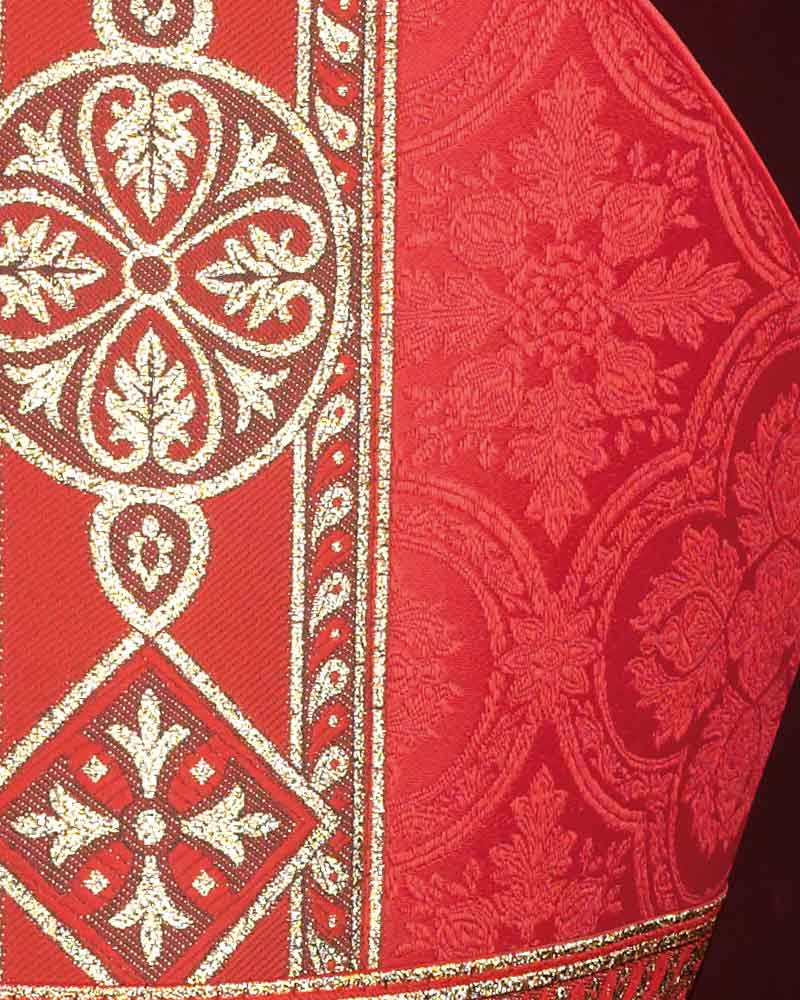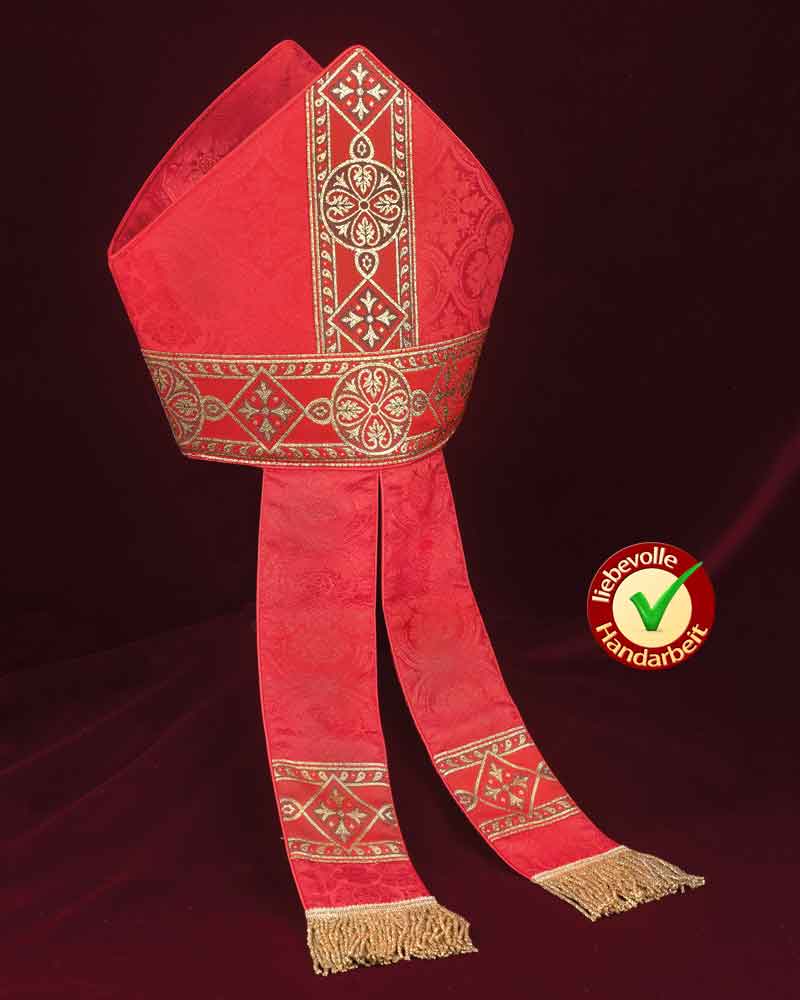 Nikolausmitra aus rotem Damast mit effektvoller, rot/goldener Barockbordüre. Verarbeitung mit stabiler Einlage, gefütterte Ausführung mit Innenhaube, Schärpen mit Borten- und Fransenbesatz.