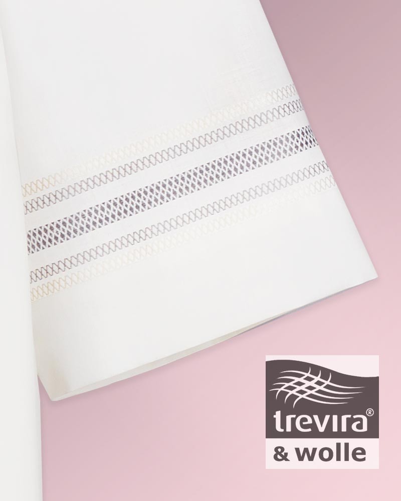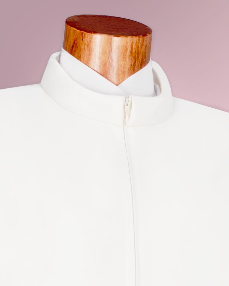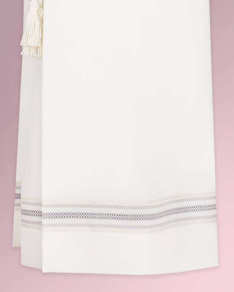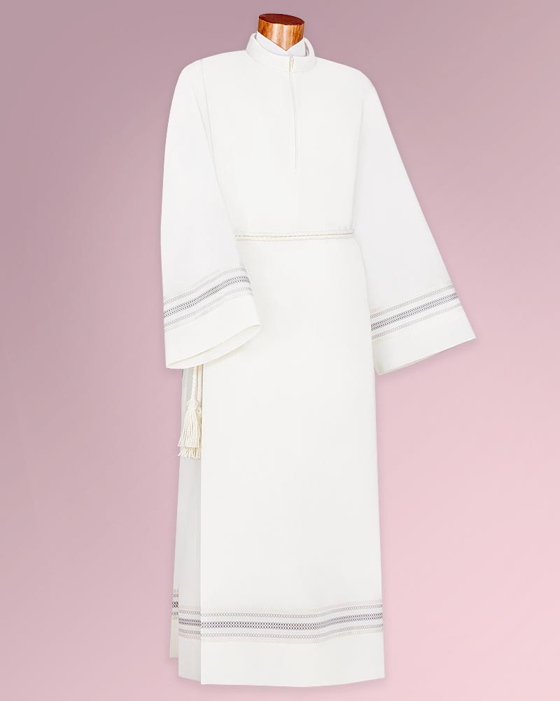 Priesteralben aus knitterarmen und pflegeleichtem Paramentenstoff in 55 % Polyester, 45 % Wolle, waschbar bei 30 Grad. Mit feinen Webbordüren an den Ärmelabschlüssen und am Albensaum. Konfektion mit Stehkragen und Reißverschluss, seitlichem Tascheneingriff.