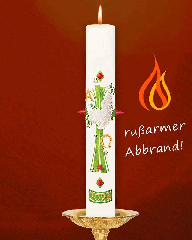 Nach traditionellen Techniken, werden die Wachsapplikationen, in harmonischer Farbgestaltung, liebevoll von Hand auf die Osterkerzen appliziert. Passend zur österlichen Liturgie wurde ein Kreuzsymbol und die Buchstaben Alpha und Omega mit goldenen Kontouren wertvoll hervorgehoben. Das RAL Gütesiegel bürgt für den rußarmen und tropffreien Abbrand der Kerze.