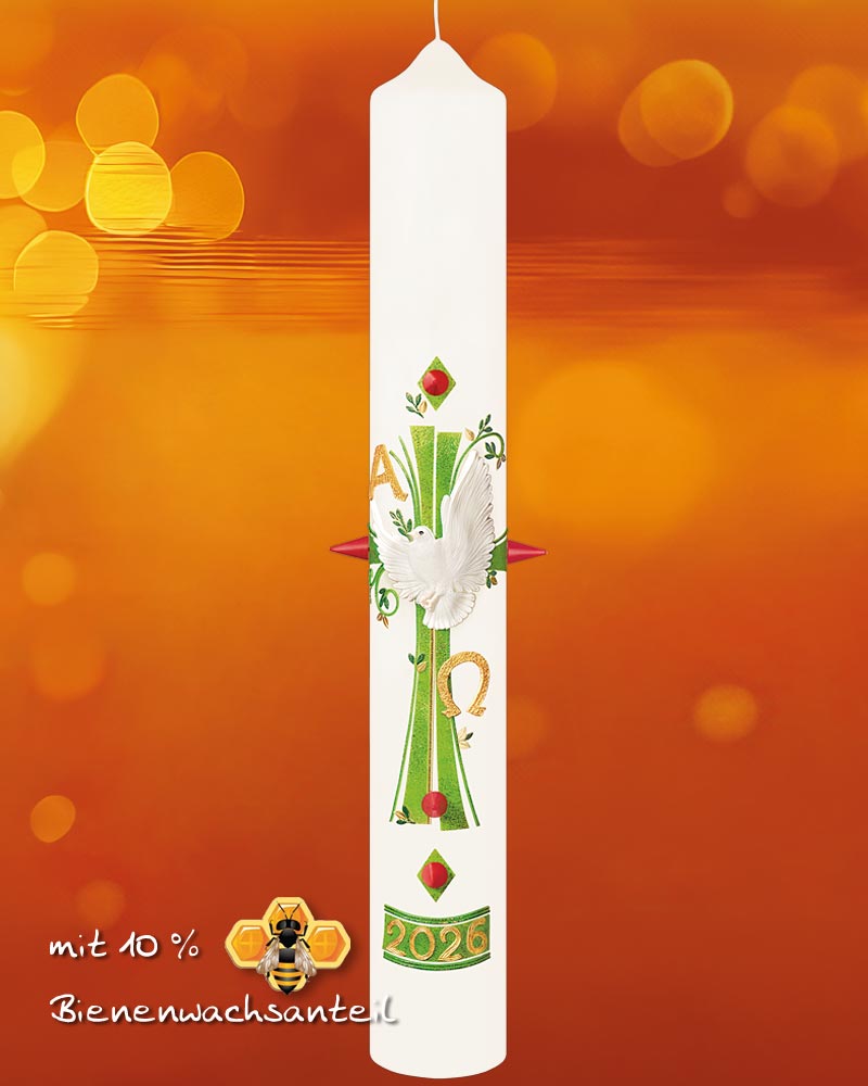 Liebevoll von Hand verzierte Osterkerze 600 x 80 mm in hochwertiger Kirchenkerzenqualität mit 10% Bienenwachs. Im Hintergrund befindet sich mittig ein grünes Kreuz und steckbare rote Nägel. Die Kerze ziert eine eindrucksvoll gestaltete weiße Taube mit wellenförmigen Flügeln, sie trägt einen Olivenzweig im Schnabel "Die frohe Botschaft".